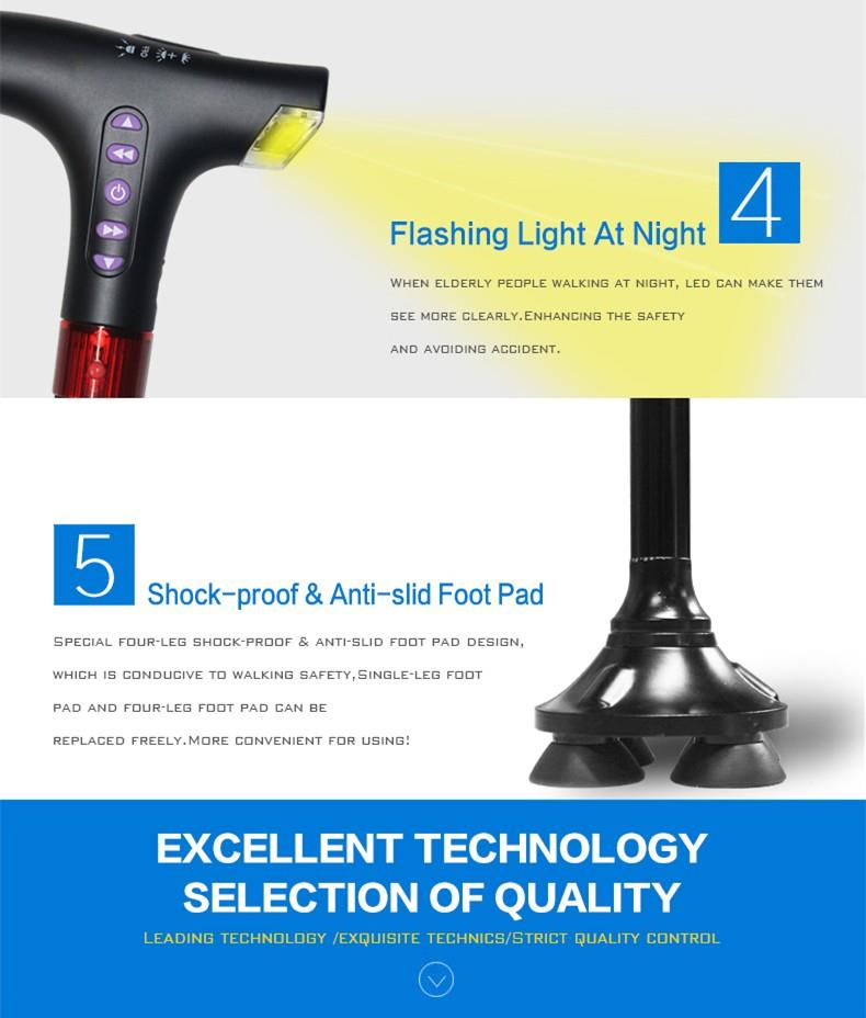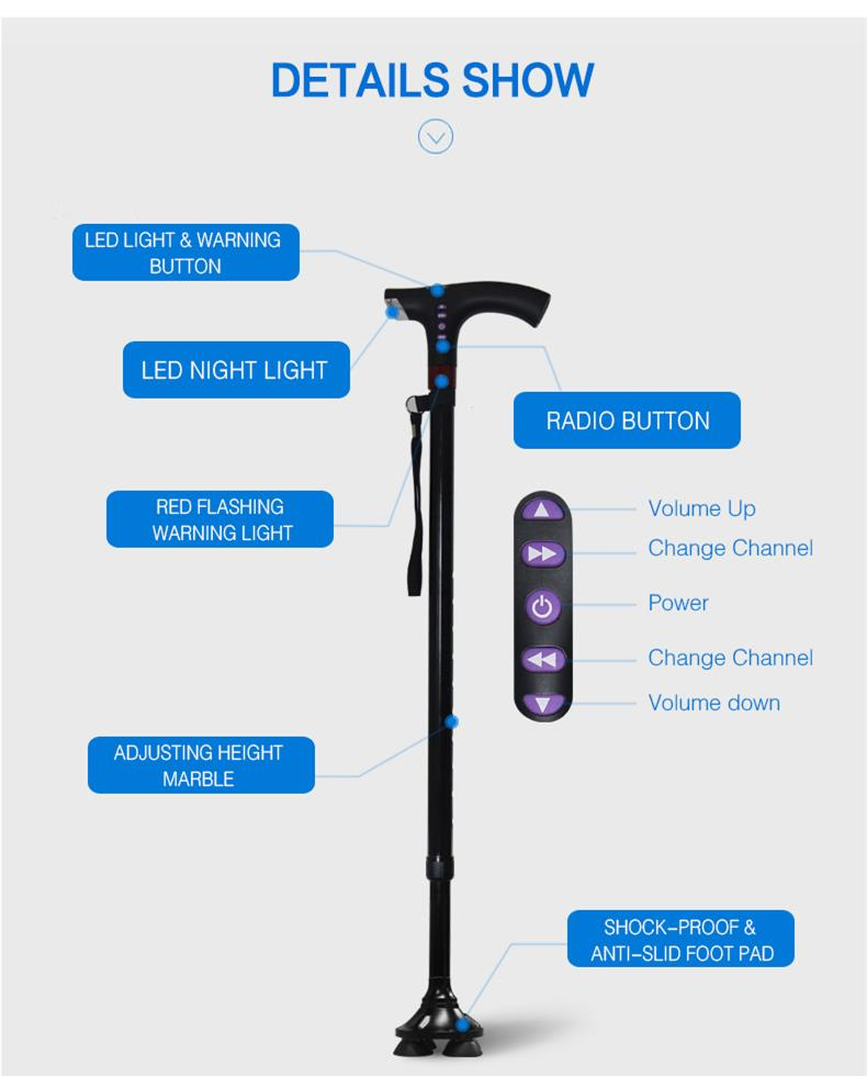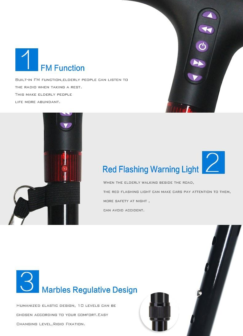 Este tipo de bastón para caminar ajustable eléctrico está hecho de materiales de alta calidad con tecnología avanzada. Tiene función FM, por lo tanto, las personas mayores pueden escuchar la radio al descansar, lo que hace que la vida de estas personas mayores sea más abundante. Además, utiliza un diseño regulador de mármol, con 10 niveles se pueden elegir de acuerdo con su comodidad. La caña de caminar ajustable eléctrica también tiene luz intermitente, lo que permite a la vieja caminata por la noche para mejorar la seguridad y evitar el accidente. Además, tiene las ventajas del diseño delicado, la larga vida útil, la baja tasa de falla, la mano de obra exquisita, el peso ligero, el alto rentable y el mantenimiento simple. Agrega almohadillas no deslizantes a las áreas en contacto con el suelo, evitando efectivamente el deslizamiento. La caña de caminar ajustable eléctrica es muy popular entre nuestros clientes en todo el mundo.
